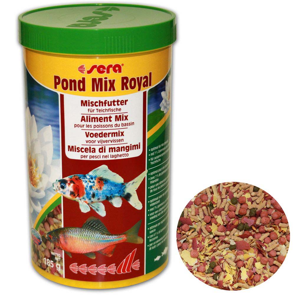 Sera pond Mix Royal, nur das beste Futter für Ihre Teichfische! Sera Mix ist ein hochwertiges Hauptfutter das ab einer Wassertemperatur von 8°C ganzjährig verfüttert wird. Ihre Fische erhalten einen ausgewogenen Mix aus Getreide, Vitamine und Eiweiß. Dazu sind die Flocken noch besonders schmackhaft, Ihre Fische werden Sera Mix Royal lieben. Die gesunde Entwicklung Ihrer verschiedenen Teichfisch-Arten liegt Sera sehr am Herzen, der Sera Mix enthält daher alles für eine gesunde Entwicklung und starke Abwehrkräfte die Ihre Teichfische benötigen. Sera pond Mix Royal enthält Flocken für Ihre kleinen Fische und drei verschiedene Granulate für die großen Teichfische, die Leckerbissen sind mit Mineralien Gammarus(7 %) angereichert. Natürlich ist das Futter, wie bei Sera üblich, formstabil und schwimmend, somit wird das Wasser nicht unnötig belastet. Füttern Sie Ihre Teichfische mit dem vielfältigen Mix für Ihren gemischten Teichbesatz.